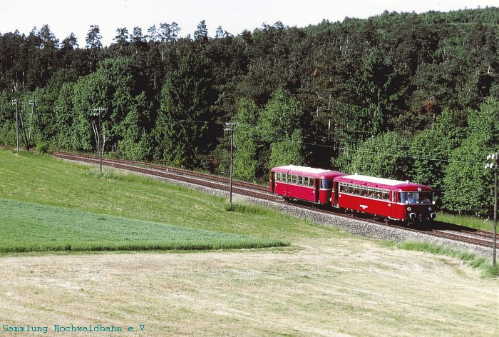 VT 55 und VB 23 kurz vor Erreichen des Ziels Hermeskeil. Das zweite Gleis gehört zur Hunsrückbahn von Simmern nach Hermeskeil.