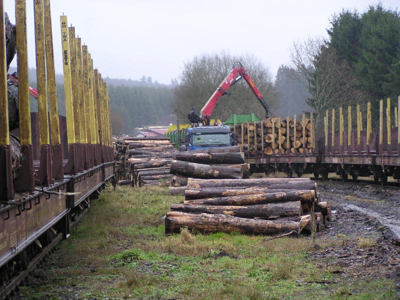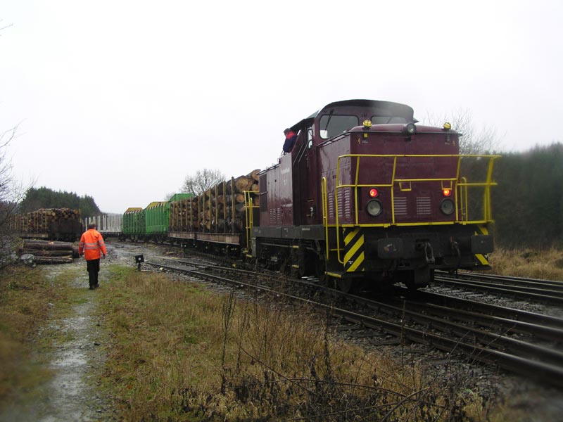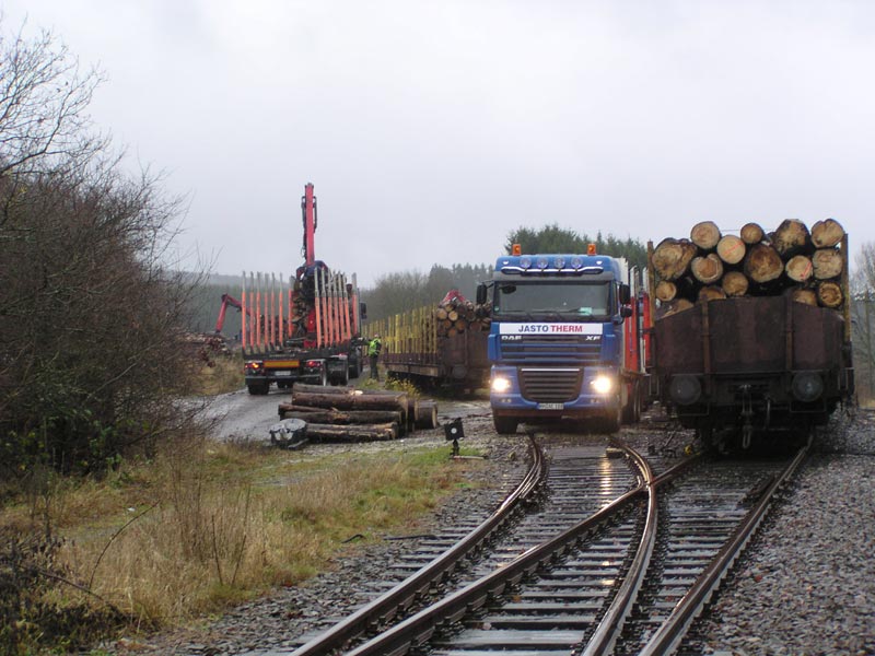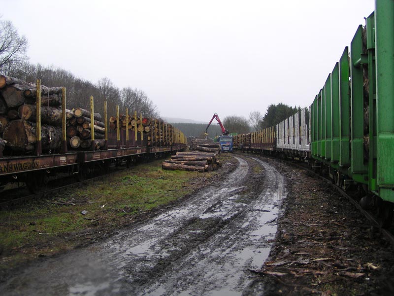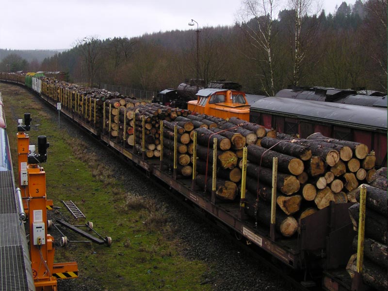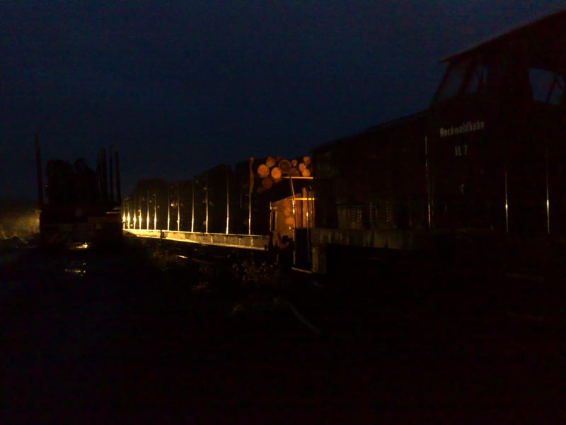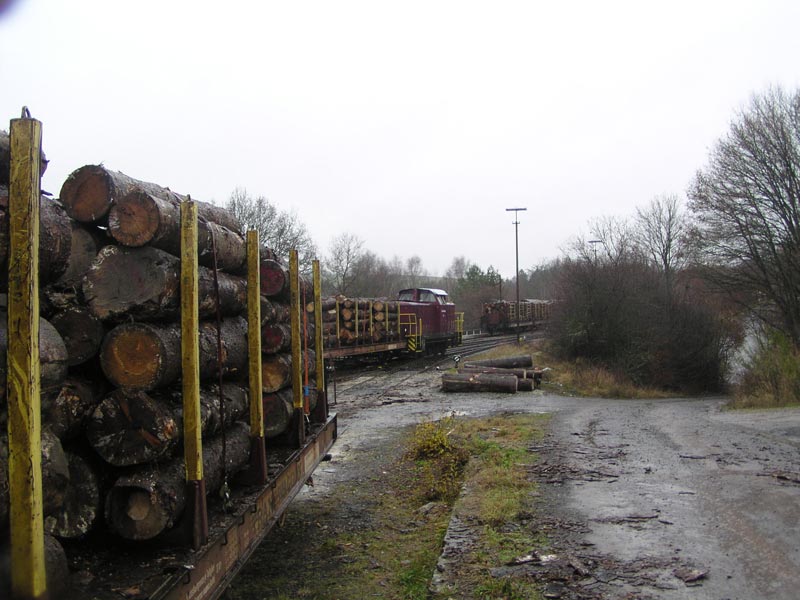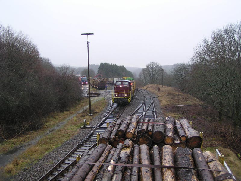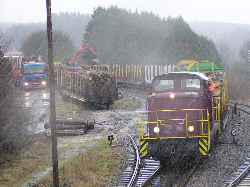 Holzzugbeladung am 11.12.2009(Text und Fotos: Nils Göttert, Felix Jacob) Am 11.12.2009 wurde in Hermeskeil ein Holzzug abgefertigt. Das Holz ging an eine Firma in Sachsen-Anhalt, die regelmäßig große Mengen zur Papierproduktion einkauft. Hier ein paar Bilder: Das erste Zugteil steht bereits beladen auf Gleis 2... ![]() ...während im Holzbahnhof noch verladen wird. Bis zu 5 LKW´s waren damit beschäftigt, den ca. 500m langen Zug zu beladen. ![]() ![]() ![]() Ein Teil des Zuges wurde mit VL7 der Hochwaldbahn etwas nach hinten gedrückt, um besser beladen zu können: ![]() Alle 3 Teile des Zuges: ![]() Zwischendurch fiel der erste Schnee in Hermeskalt. ![]() Blick zurück von den Verladegleisen Richtung Bahnhof: ![]() Bis in die Abendstunden hinein wurde verladen: ![]() Der Zug wurde übrigens anschließend vom Blue Tiger über die Nahestrecke Richtung Sachsen-Anhalt befördert. |