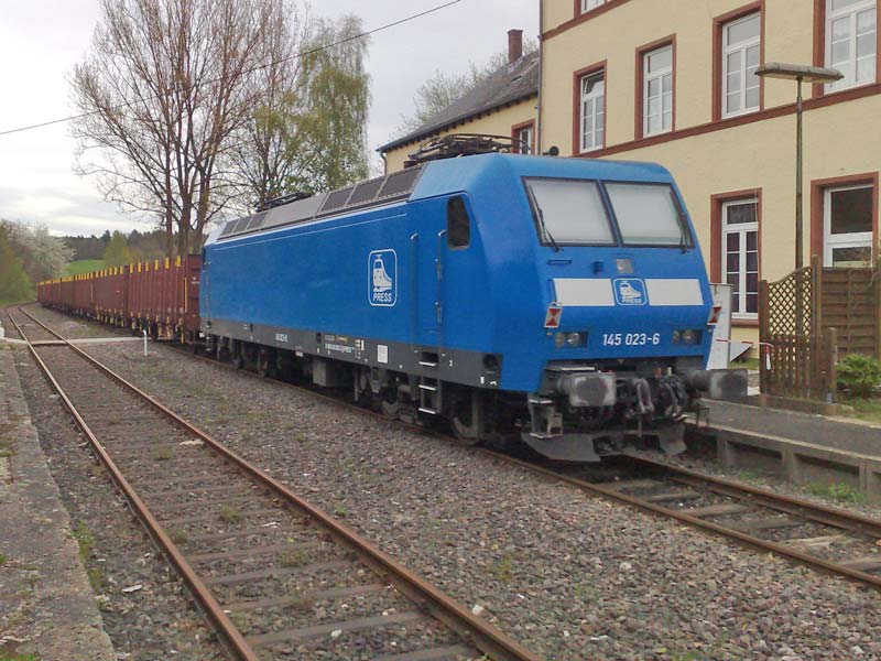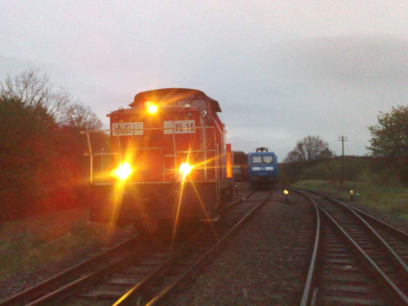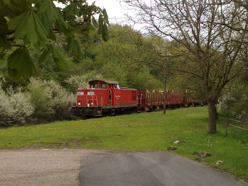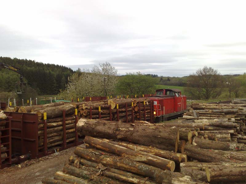 Holzzugbeladung am 05.05.2010(Text und Fotos: Nils Göttert) Am 05.05. hatte ich in Hermeskeil mal wieder die Gelegenheit, ein paar Fotos von der Abfertigung eines Holzzuges zu machen. Die Leerwagen wurden kamen mit 145 023-5 der Pressnitztalbahn bis Türkismühle und wurden von dort in 2 Teilen mit der VL 16 der HWB nach Hermeskeil befördert. Hier nun der Bildbericht: Der 2. Teil des Zuges mit VL 16 in Schwarzenbach: ![]() Blick auf den ganzen Zug in Nonnweiler (der blaue Fleck ganz hinten ist die 145 der Pressnitztalbahn und gleichzeitig Zugschluss). ![]() Elektrotraktion auf der Hochwaldbahn? ![]() Nein, natürlich nicht. Und nochmal kurz die Illusion der Elektrotraktion: ![]() Rangieren im Holzbahnhof: ![]() Reger Verladebetrieb: ![]() Die Dämmerung bricht ein: ![]() ![]() Der Leerzug vor dem Bahnhofsgebäude Hermeskeil: ![]() Insgesammt wurden in Hermeskeil am 05./06.05.2010 40 Rungenwagen mit Holz beladen. Das dies eine riesige Entlastung für unsere Straßen bedeutet, kann sich jeder selbst vorstellen. |