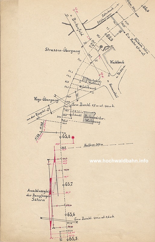 Der Anschluss der Dampfziegelei Sötern (nicht mehr existent) sowie die heute noch vorhandenen Bahnübergänge in Waldbach.
