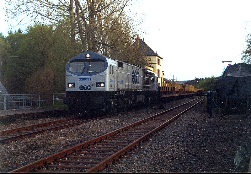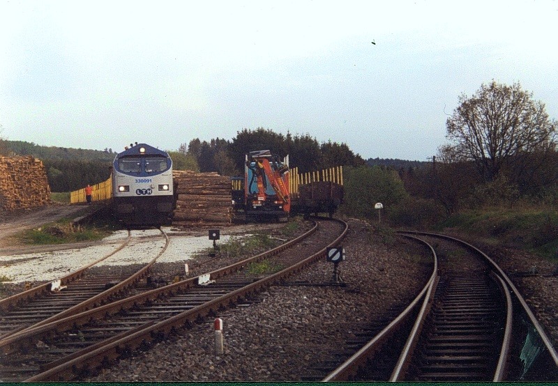 Einfahrt eines Holzzuges mit LTH/OHE 330091 in Hermeskeil am 02.05.05: