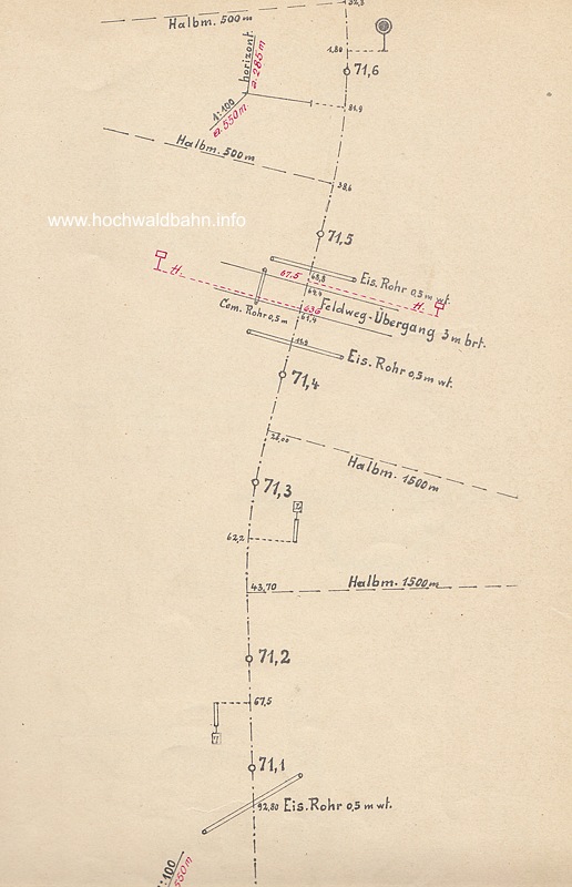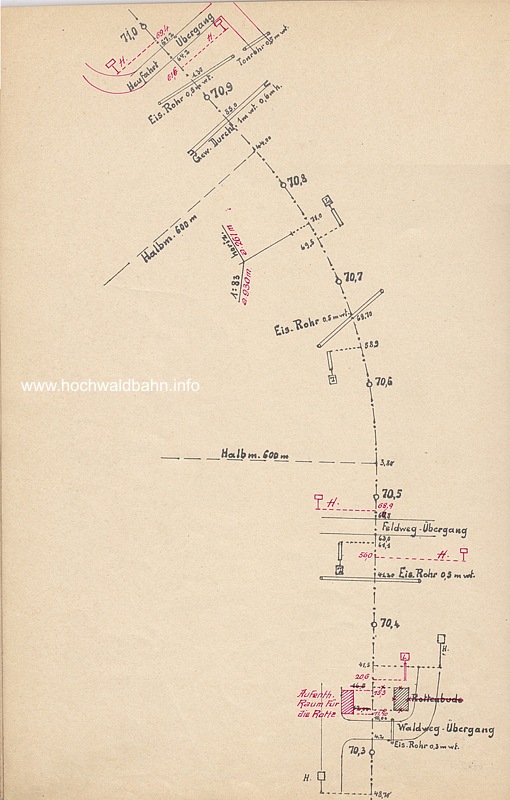 Die "endgültige Stationierung der Strecke Nonnweiler - Türkismühle", Eisenbahndirektionsbezirk Saarbrücken, aufgenommen am 14.04.1911 mit Ergänzungsmessungen vom Dez. 1913, zeigt den Streckenabschnitt um den Bahnübergang in Kilometer 71,0, an dem der heutige Bahnsteig entstanden ist: