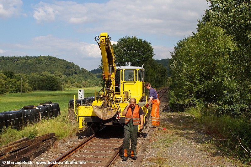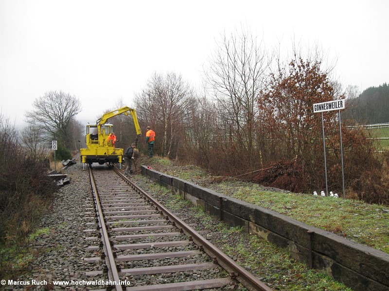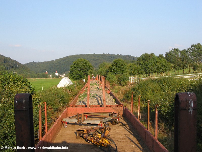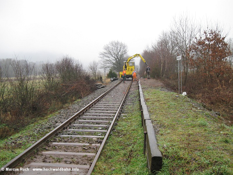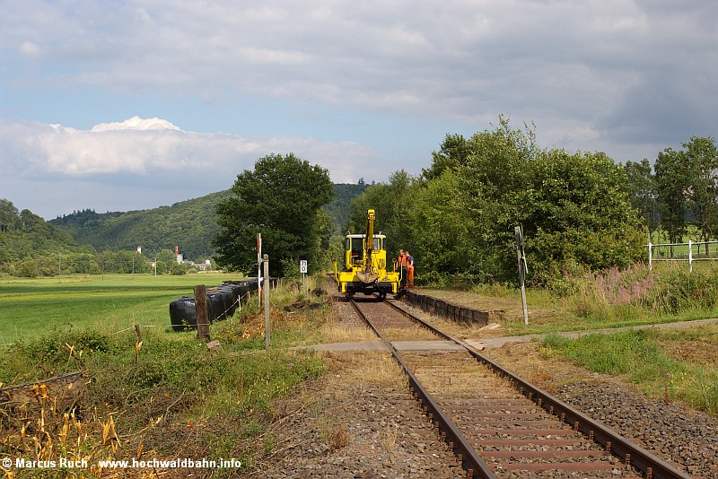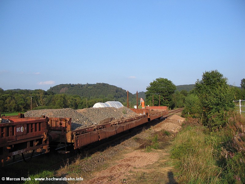 Nachfolgend einige Bilder noch ohne Haltepunkt, als hier nur der auch heute noch vorhandene Bahnübergang existierte: Der Bau des Bahnsteigs begann am 03.09.2005 und wurde von den Vereinsmitgliedern des Hochwaldbahn e.V. bzw. der Nachfolgeorganisation Förderverein Hunsrückbahn e.V. in ehrenamtlicher Arbeit erstellt. Als Bahnsteigkante wurden altbrauchbare Holzschwellen verwendet, während der Bahnsteig selbst aus einer Aufschüttung besteht - eine Bauart wie sie früher bei Klein- und Sekundärbahnen üblich war. Die Bilder dokumentieren den Aufbau und Ausbau des Haltepunktes: |